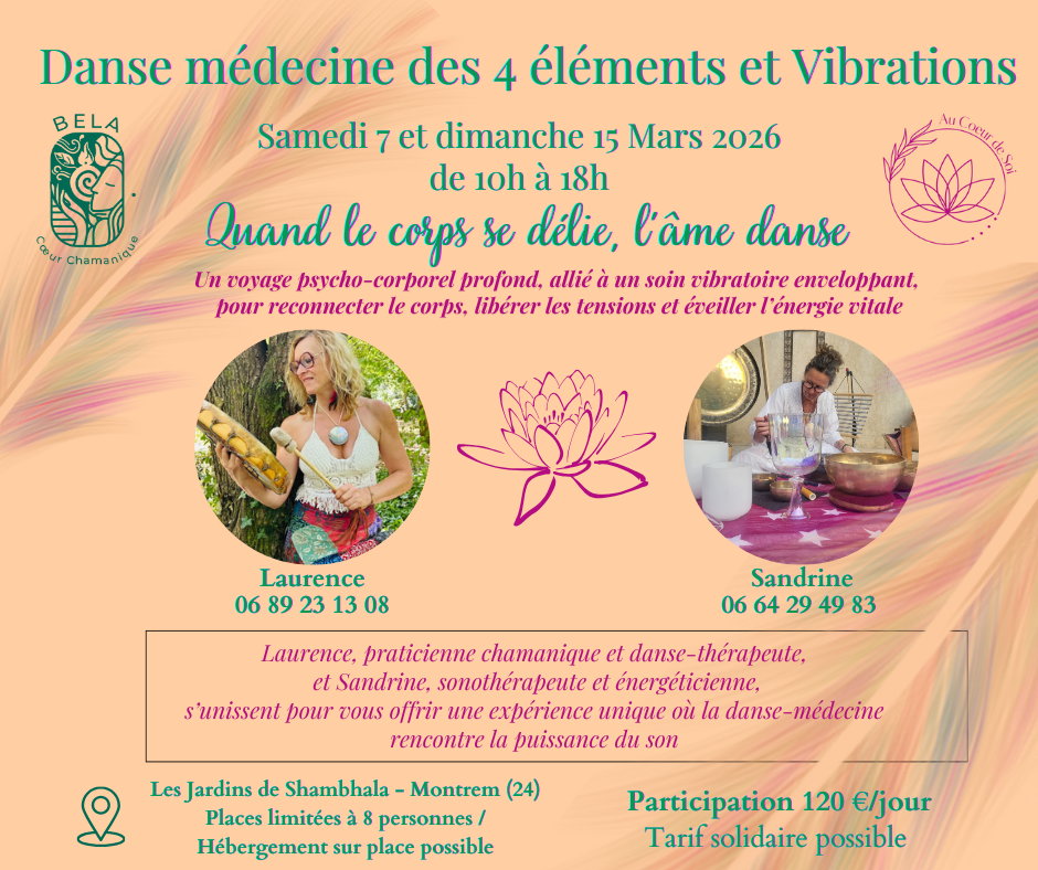 Deux journées immersives pour reconnecter le corps, libérer les émotions et éveiller l’énergie vitale à travers la danse médecine, les vibrations sonores et les rituels des 4 éléments : Terre, Eau, Feu et Air.